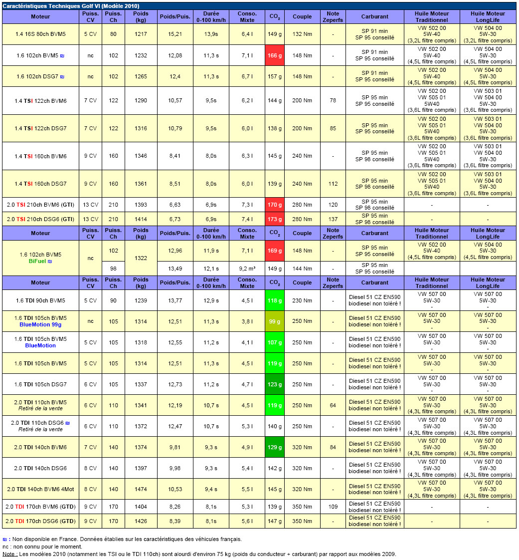 Ce document compare les performances de chacune des motorisations proposées par Volkswagen.